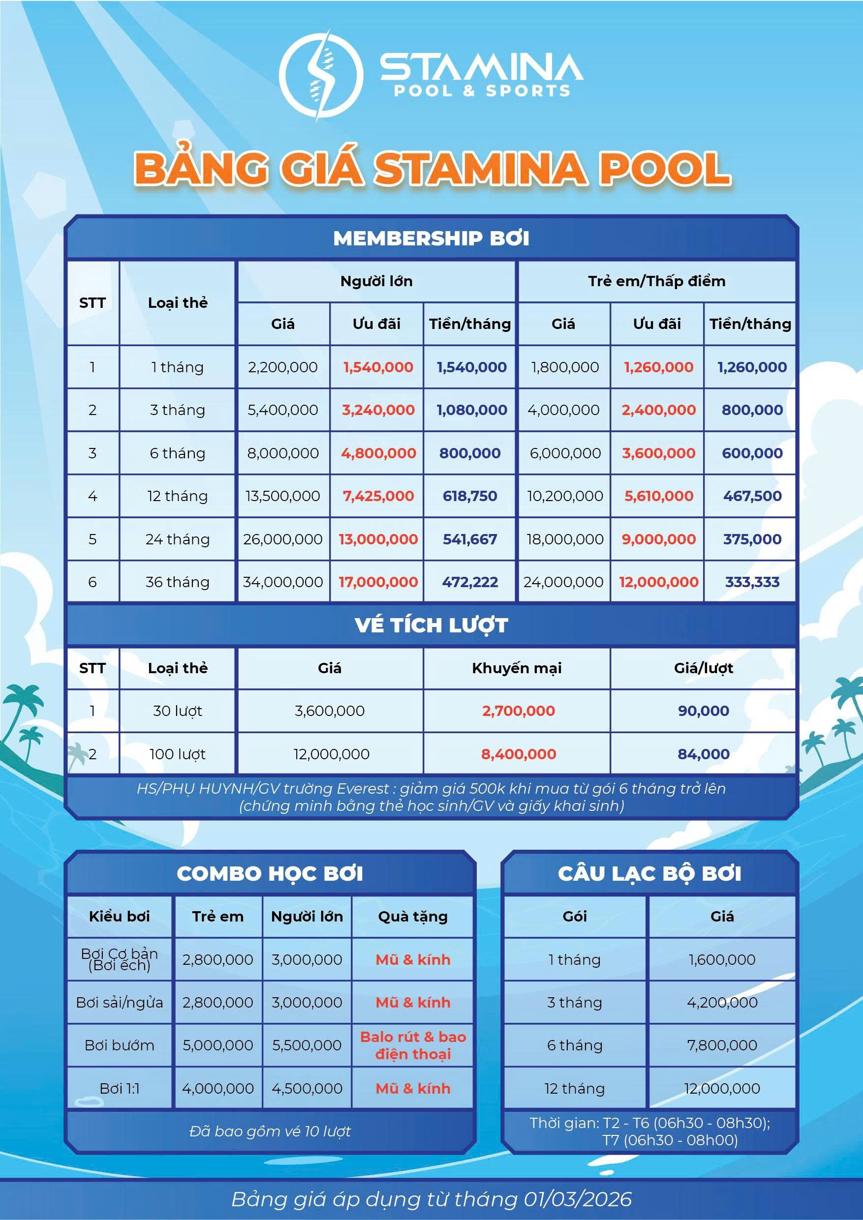 Tại Stamina Pool – một bể bơi 4 mùa trong nhà tại khu vực Hoàng Quốc Việt, bảng giá được thiết kế theo nhiều nhu cầu khác nhau. Vé lượt phù hợp cho người đi bơi linh hoạt theo ngày, trong khi các gói vé tháng hoặc thẻ dài hạn sẽ giúp tiết kiệm đáng kể nếu duy trì tần suất bơi thường xuyên.
